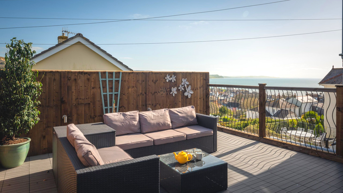 An idyllic retreat with a spacious terrace overlooking Lyme Bay and the Jurassic Coastline