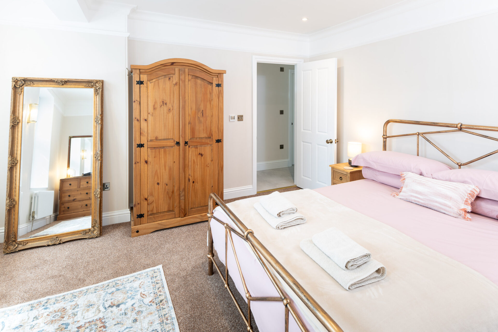 The property has its own front door. Inside, the interiors have a very traditional cottage feel, with two good sized bedrooms as you enter. The bedrooms have a luxurious carpet underfoot whilst the rest of the property is stone tiles with underfloor heating to give that extra bit comfort on in the colder months. One of the bedrooms has an en-suite bathroom looking out to the garden and the second bathroom is located on on the opposite side of the hallway to the master bedroom.